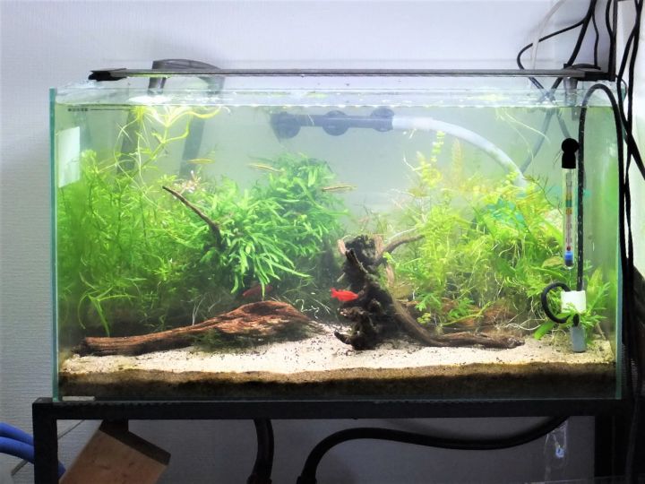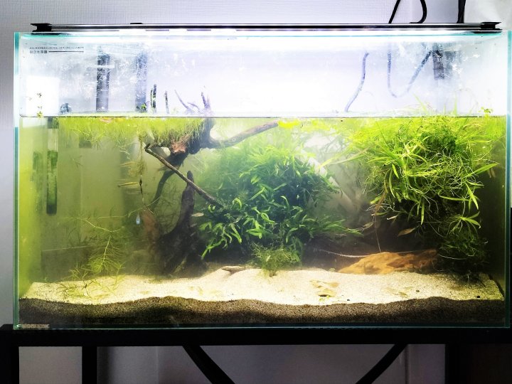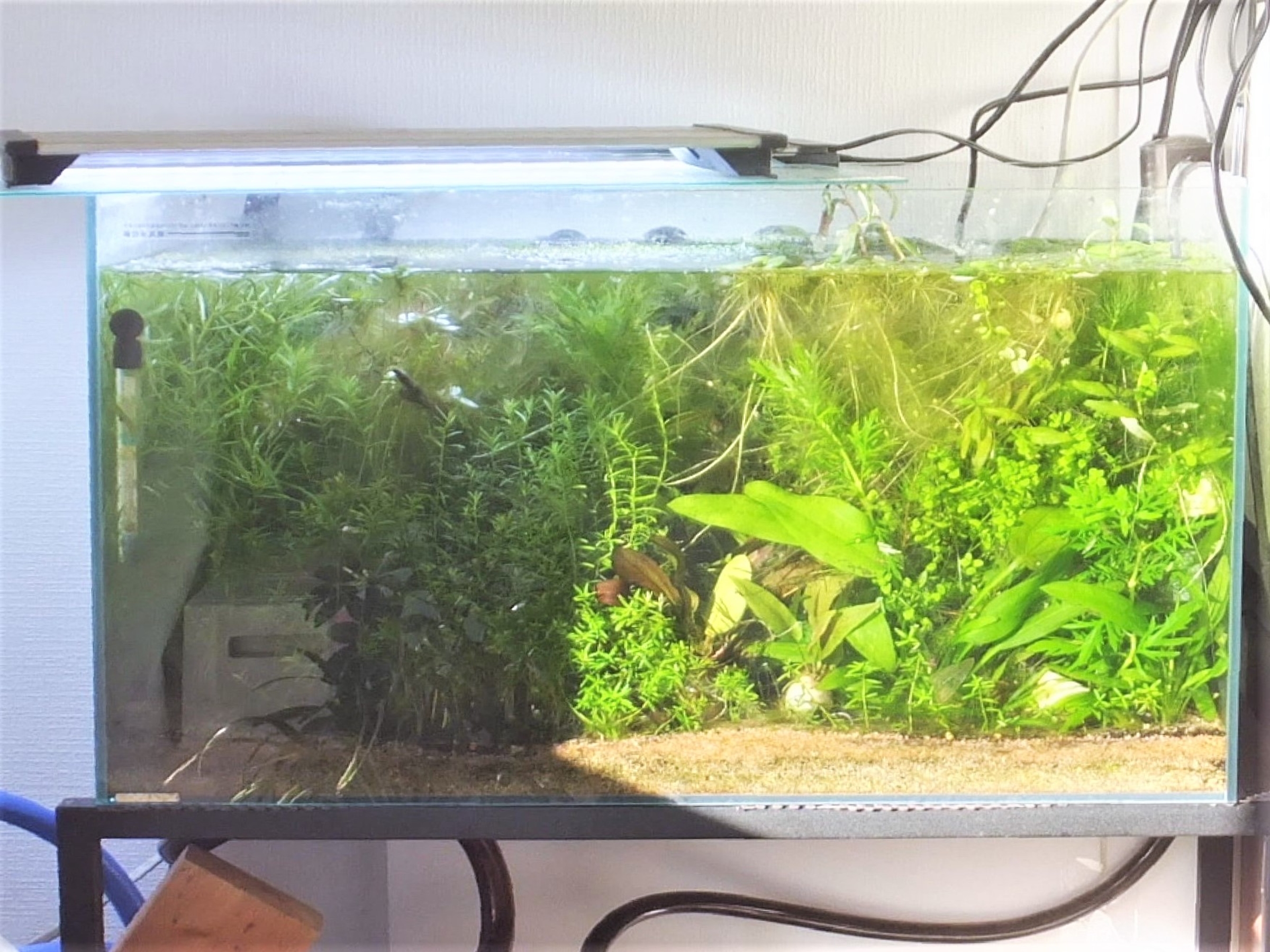 餌を控えれば良いと思ったかもしれないが、その時の水槽は水草だらけで、水草や流木、石のレイアウトもあり、水槽の全ての魚に餌が行き渡るように与えないと、と思ったので、控えめに与えるのは難しかったのだ。