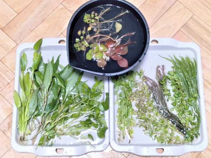 元々その水槽には、ミクロソリウム トライデントリーフ、パールグラス、リシア、ナヤス グアダルペンシス、ミズゼニゴケ、クリプトコリネ sp.(多分、ベケッティ)が残っている。その他には、浮葉をつけたタイニムファもあるが、このリセットした水槽に使わないかもしれない。