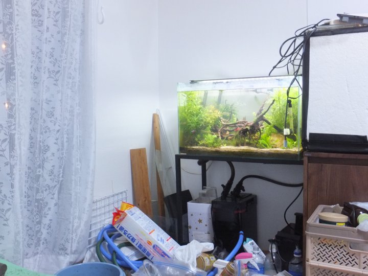 '24年4月いっぱいまで住んでいた旧宅では、熱帯魚・水草水槽の環境は整っていた。底砂は、ソイルと化粧砂を、決めた場所に応じてきっちりと敷き分けていた。