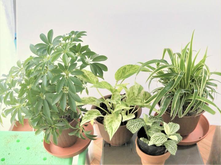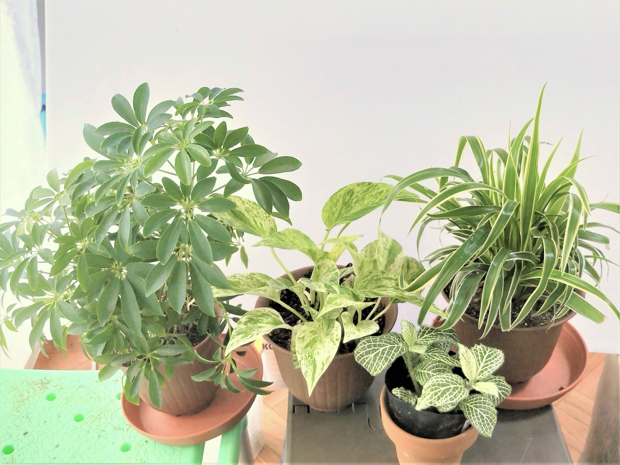 左から、カポック、ポトス、フィットニア、シャムオリヅルラン。