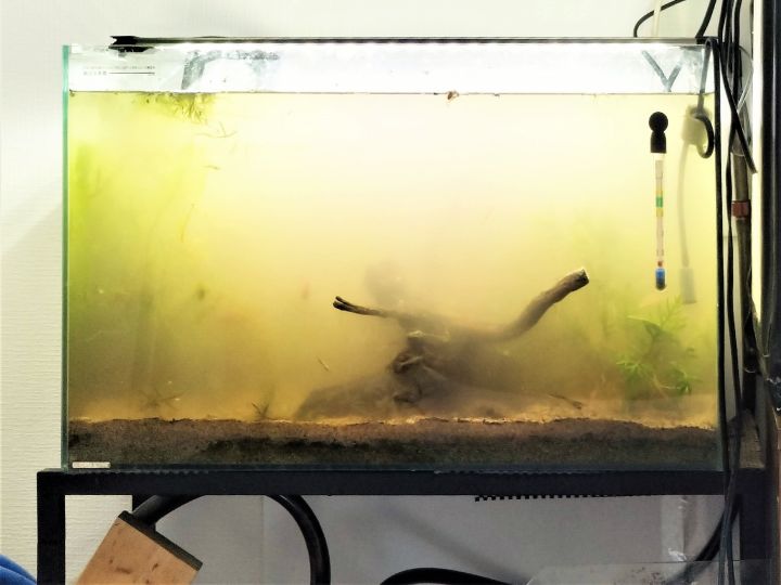 とにかく水が濁ったことで、水槽の奥の部分の様子が非常にわかりにくくなった。そのため、今日入れたソイルを均したり、水草を植えたりするのは、明日以降に延期することにした。