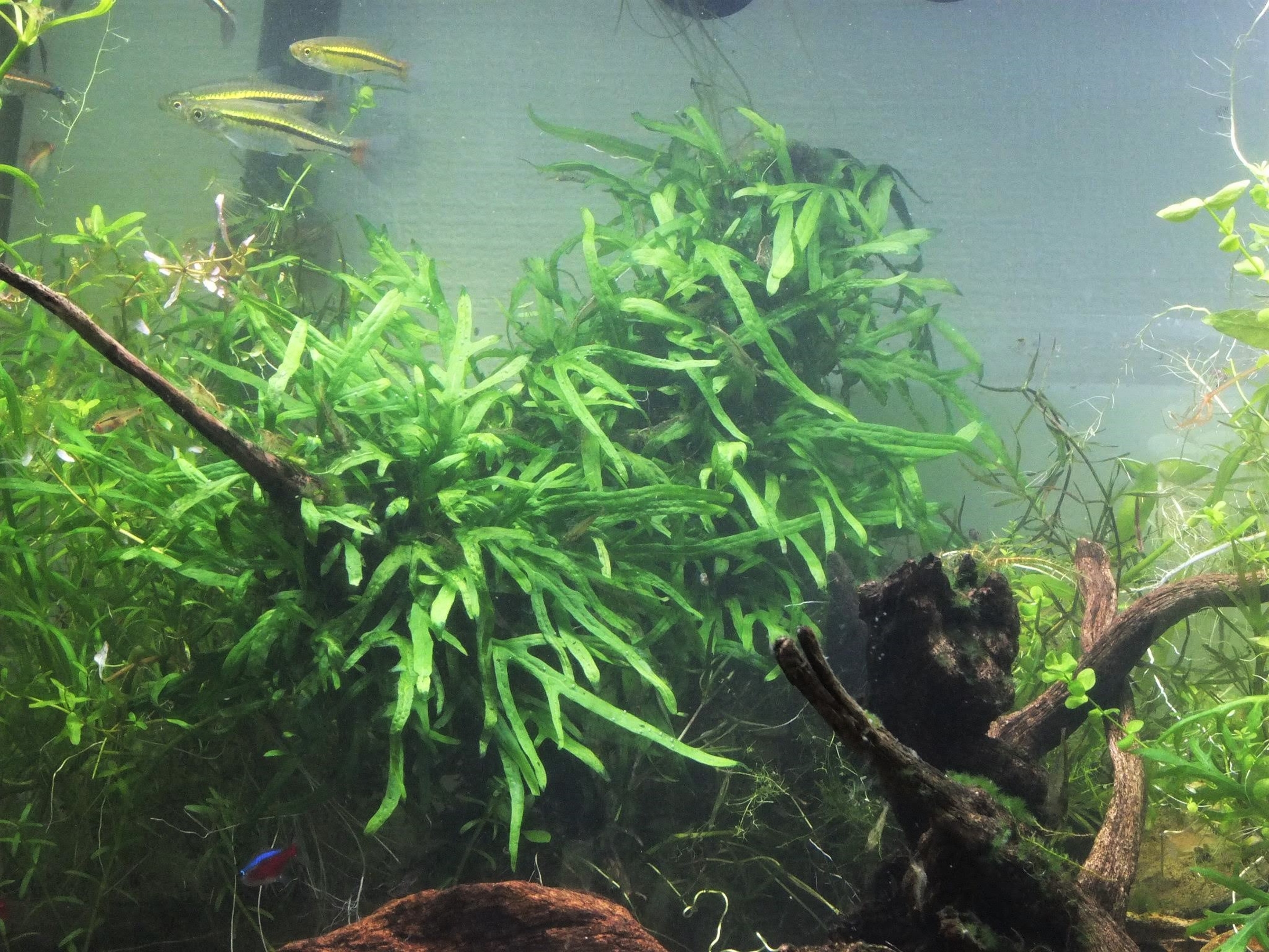 リセット後の新しいレイアウトは、数日かけて整えるつもりだ。今日はこんなところ。この水生シダはミクロソリウム sp. “トライデントリーフ”で、2014年に導入したものが枯れずに息づいているもの。